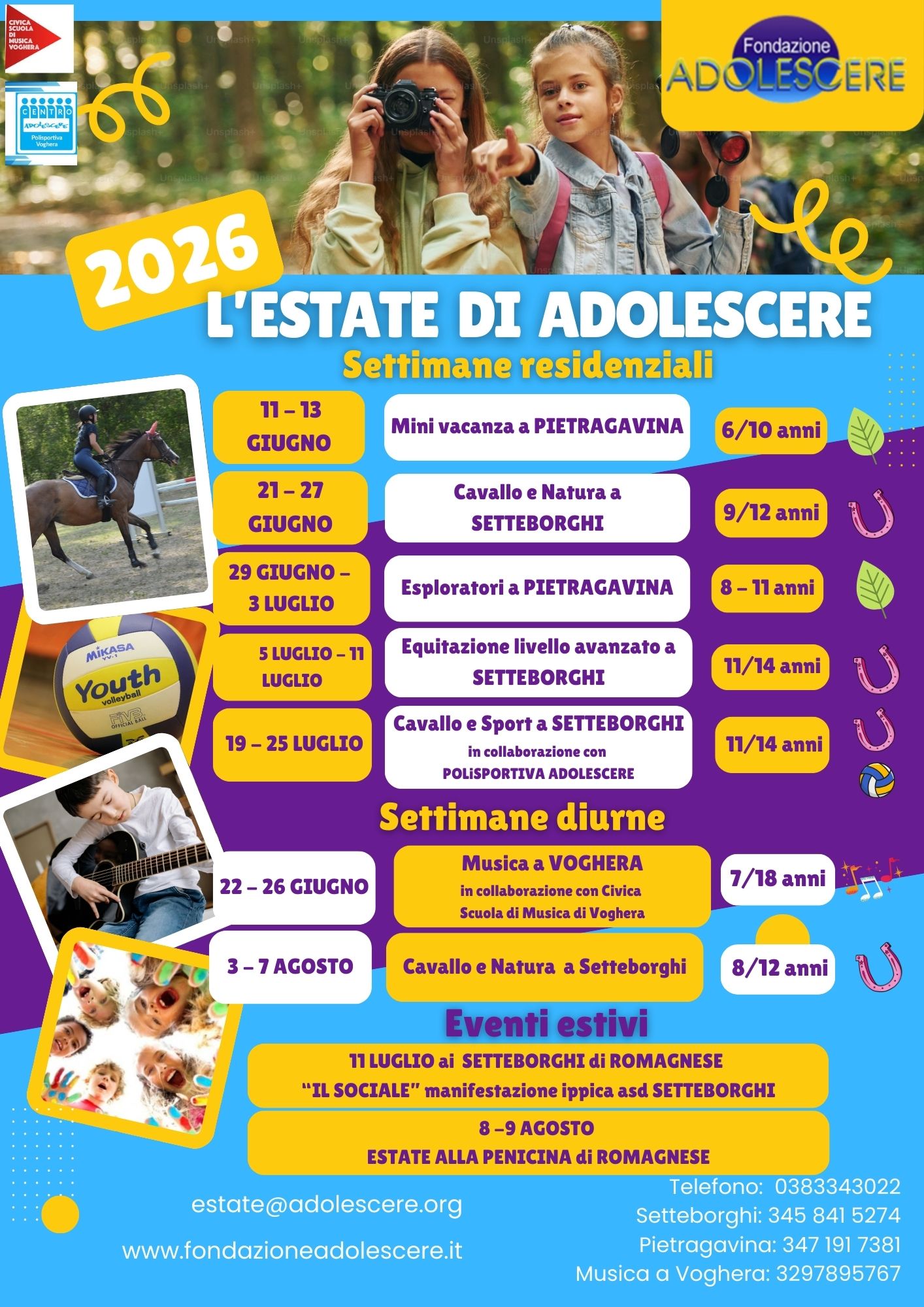 Un’intera settimana residenziale, in compagnia di nuovi amici, dei cavalli e della natura dei Setteborghi di Romagnese e l’energia dello Sport. Accompagnati da educatori e istruttori sportivi della Polisportiva Pallavolo Adolescere, la settimana prevede attività sportive di diverse discipline, esperienze di gruppo, avvicinamento al cavallo, laboratori creativi.